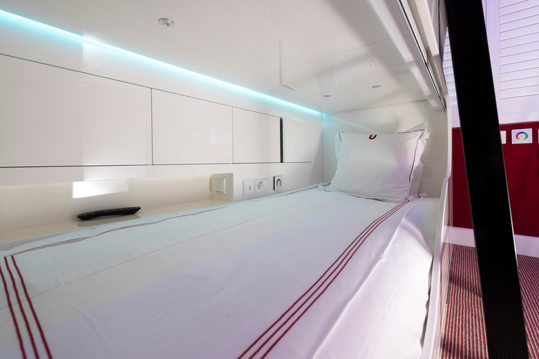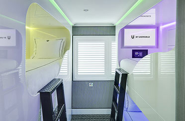Our Classic Triple bedrooms include waterfront views, adjustable mood lighting, built-in Bluetooth speakers, 3 super comfy Savoir twin mattresses (one lofted bed and one bunk bed), each featuring its own flat-screen TV, outlets with a variety of plugs (including USB ports), ample storage space and safe.