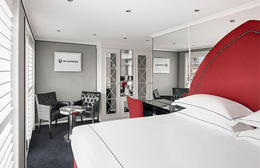 Suites include a french balcony with waterfront views, super comfy Savoir mattresses, built-in Bluetooth speakers, flatscreen TVs, plenty of outlets with a variety of plugs (including USB ports), a desk, table and chairs, extra storage space and a safe