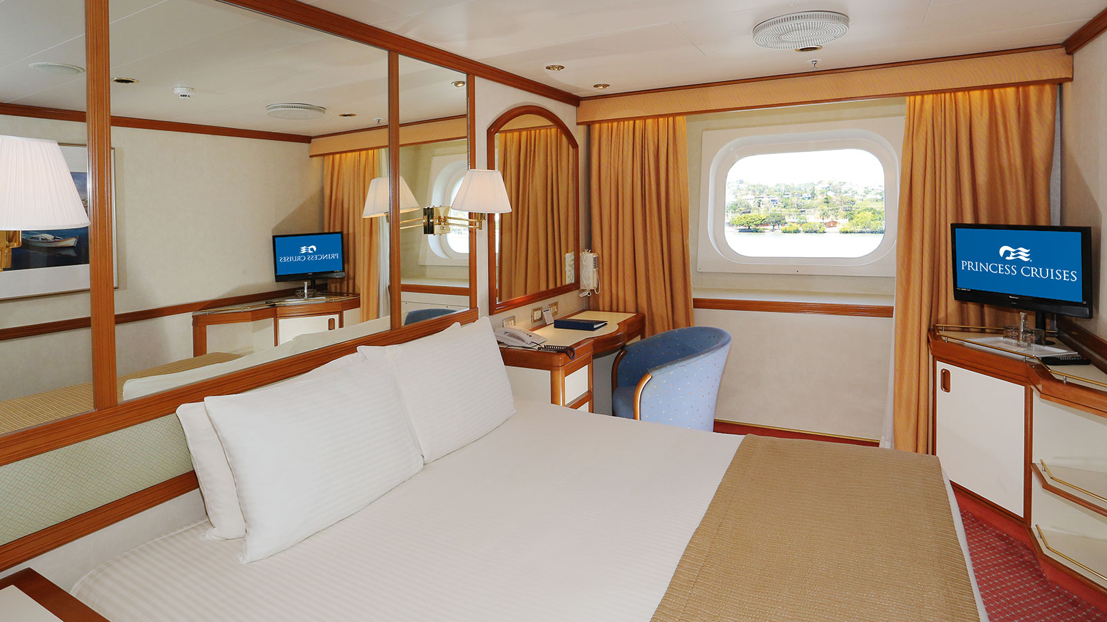 Passengers traveling in these categories of staterooms enjoy two lower beds which make up into an inviting queen-size bed. The TV, refrigerator, spacious closet and picture window add to the comfort and stylish decor. Views are obstructed in category F. The average square feet ranges from 147 to 155.