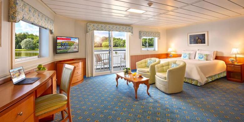 SB1 staterooms on the main deck offer complete comfort with approximately 275 sq. ft. of living space. Enjoy a full-size bathroom, large picture window, and door leading out to a furnished private balcony. These staterooms also feature a large sitting area, ideal for getting together with friends.